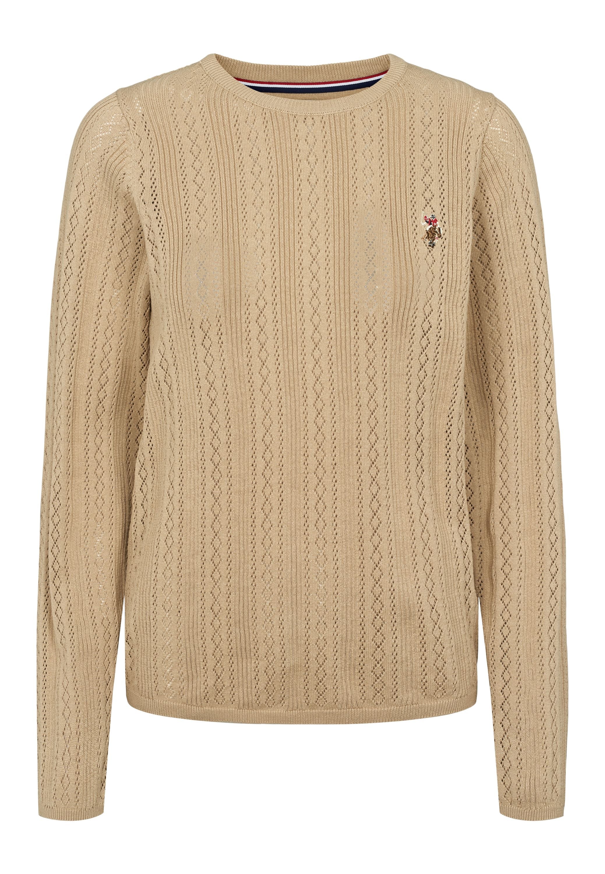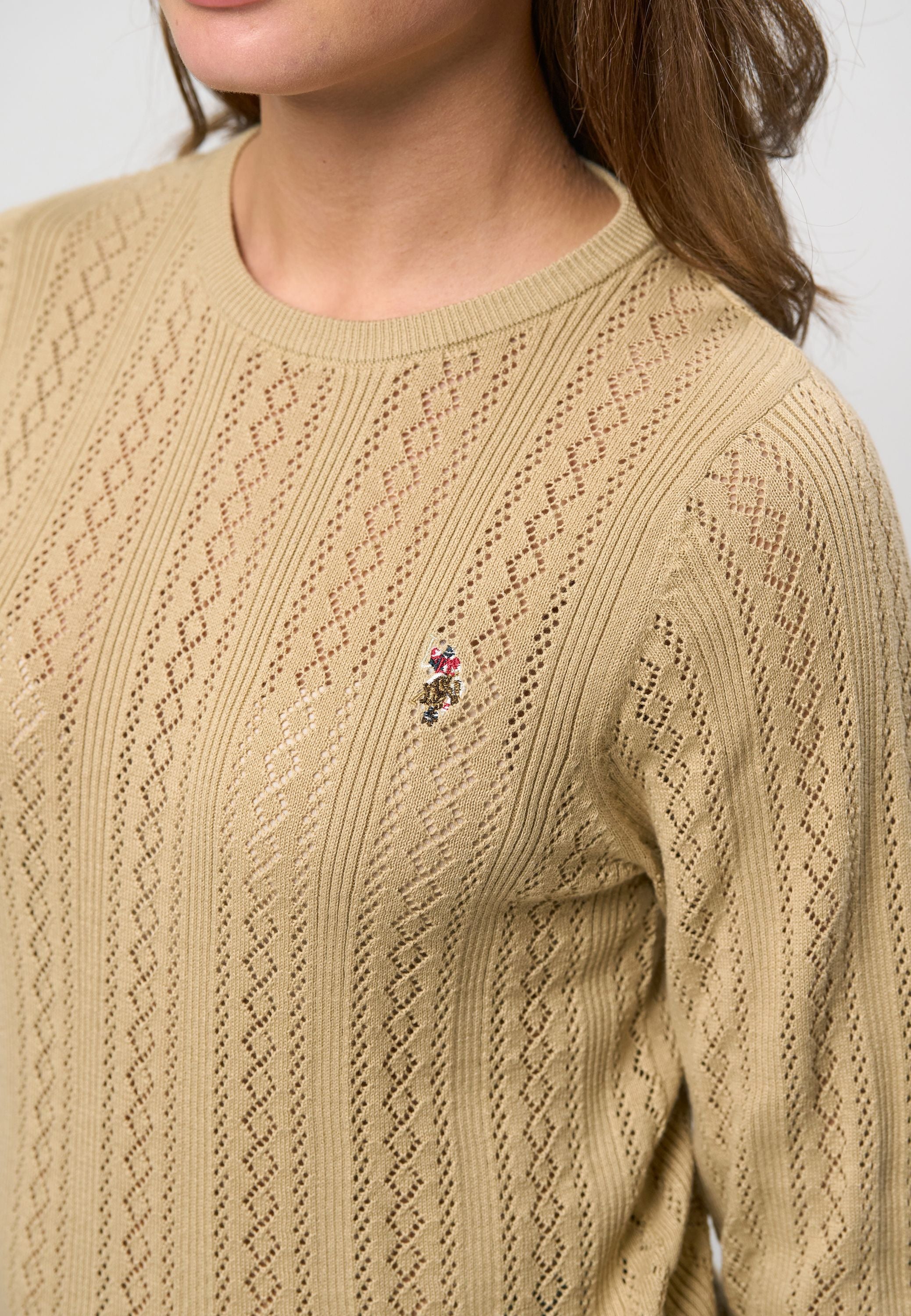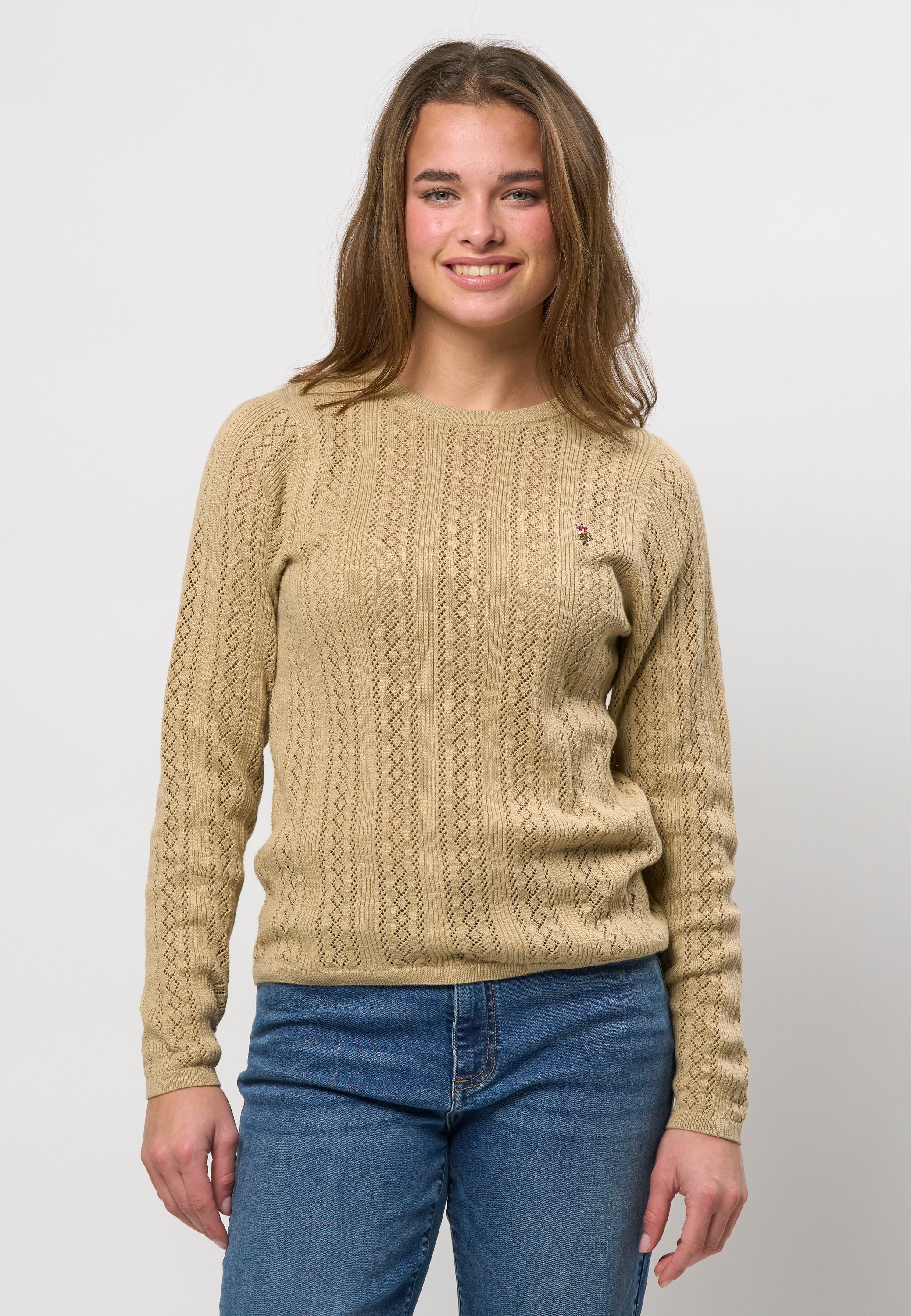 Mynthe er en elegant og feminin striktrøje, der kombinerer klassisk design med moderne lethed. Den er fremstillet i 100 % økologisk bomuld og har et smukt hulmønster, der giver et sofistikeret og luftigt udtryk. Rund halsudskæring og fine ribkanter afslutter looket på diskret vis, mens det broderede U.S. Polo Assn.-logo på brystet tilføjer et eksklusivt touch. Perfekt til både hverdagsbrug og til lag-på-lag styling i de køligere måneder.