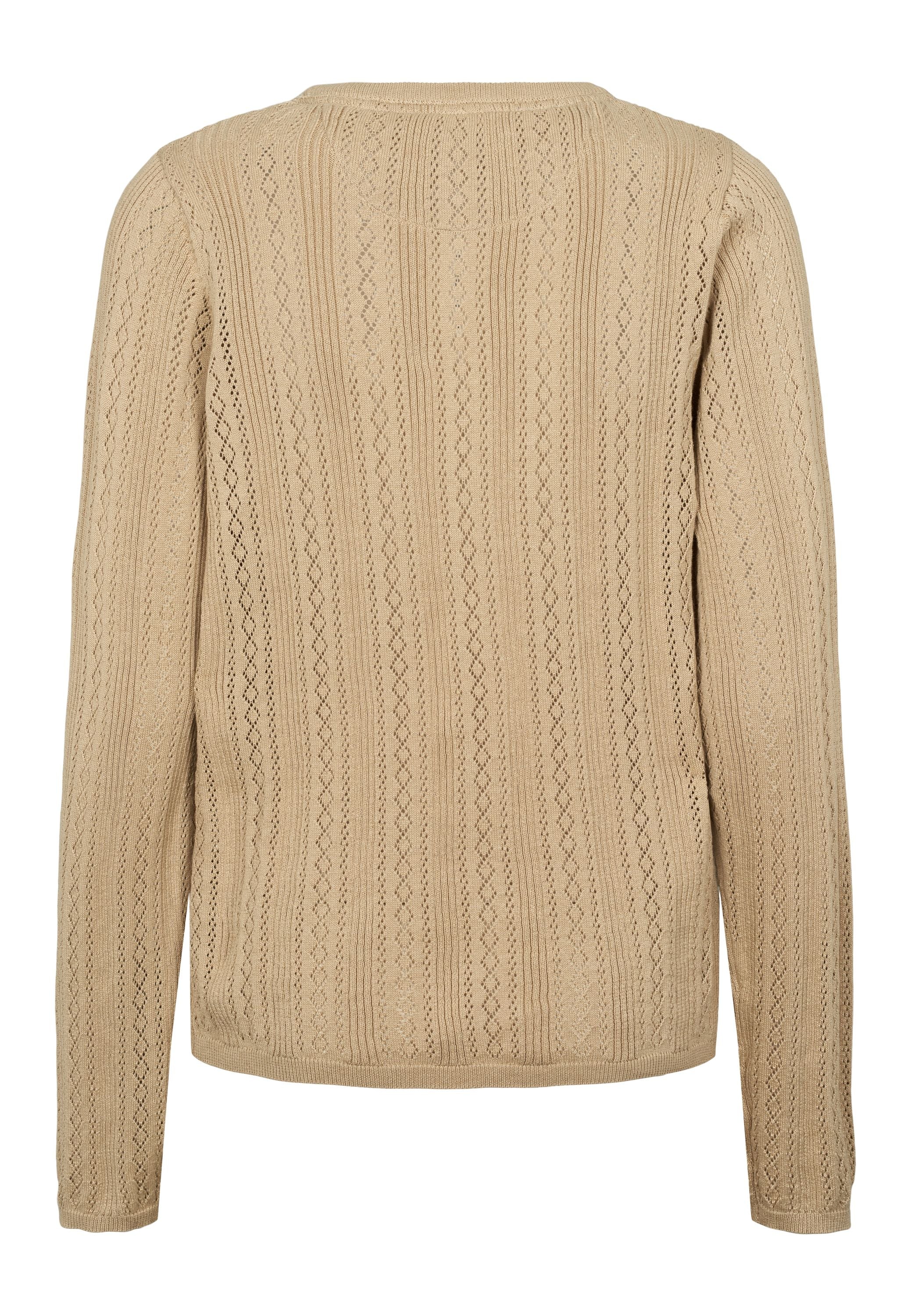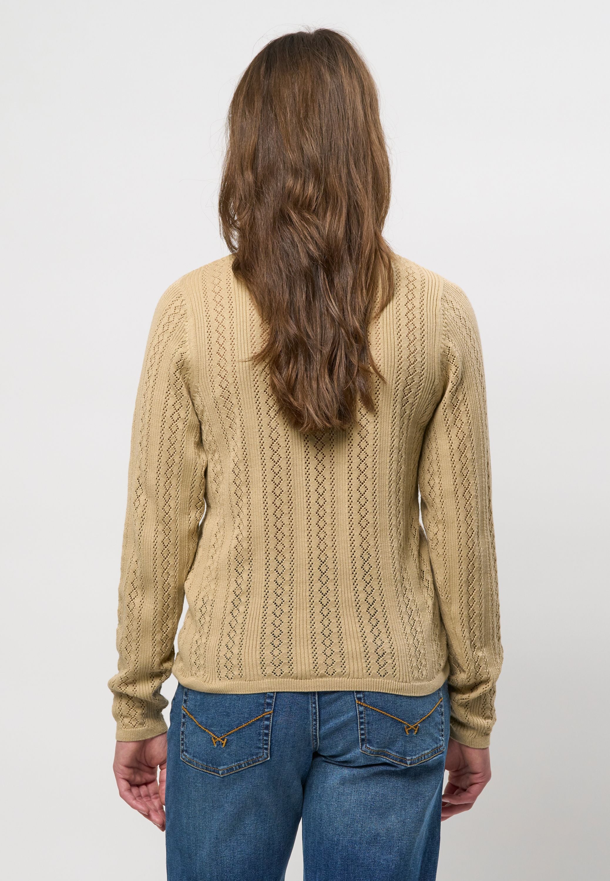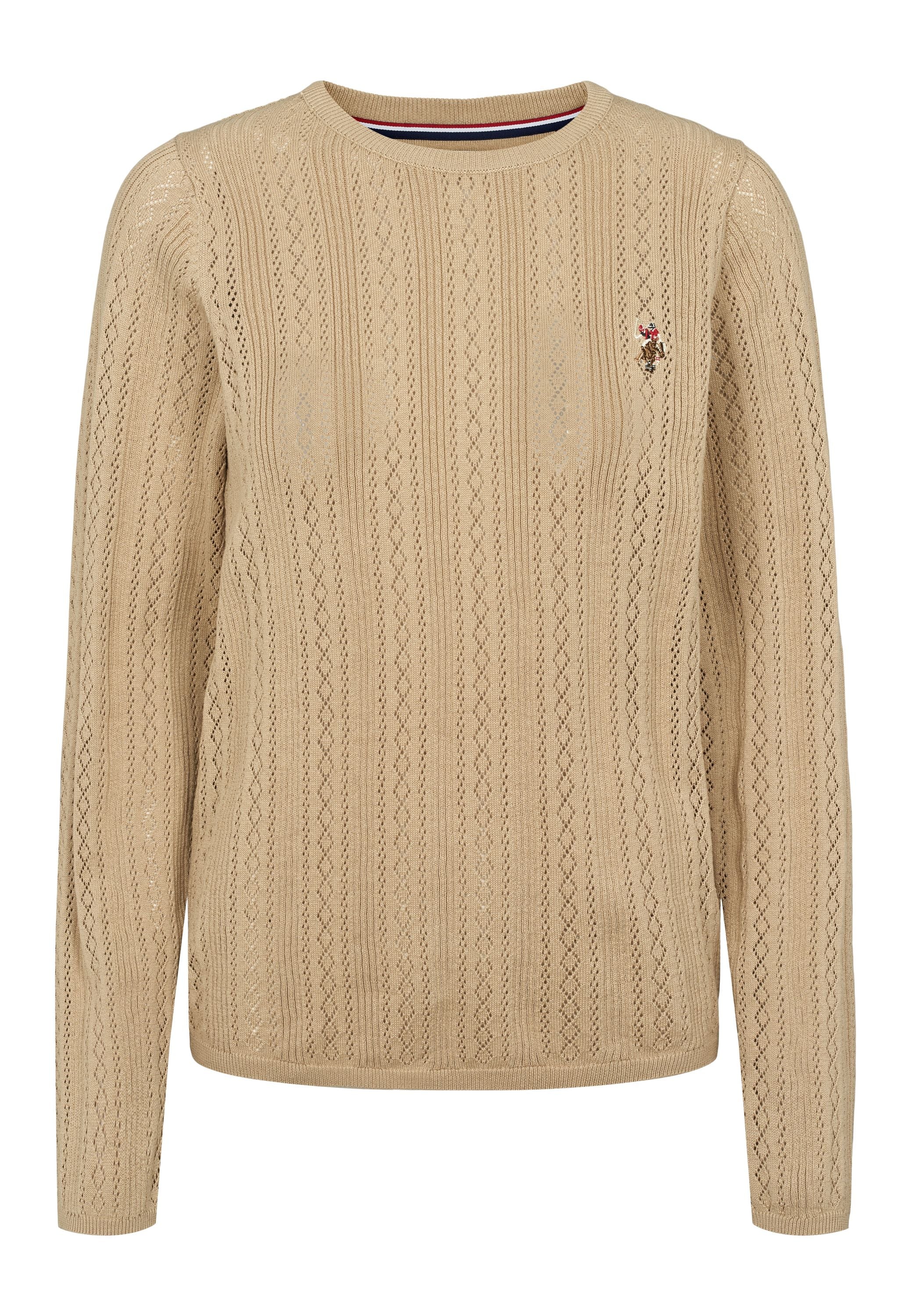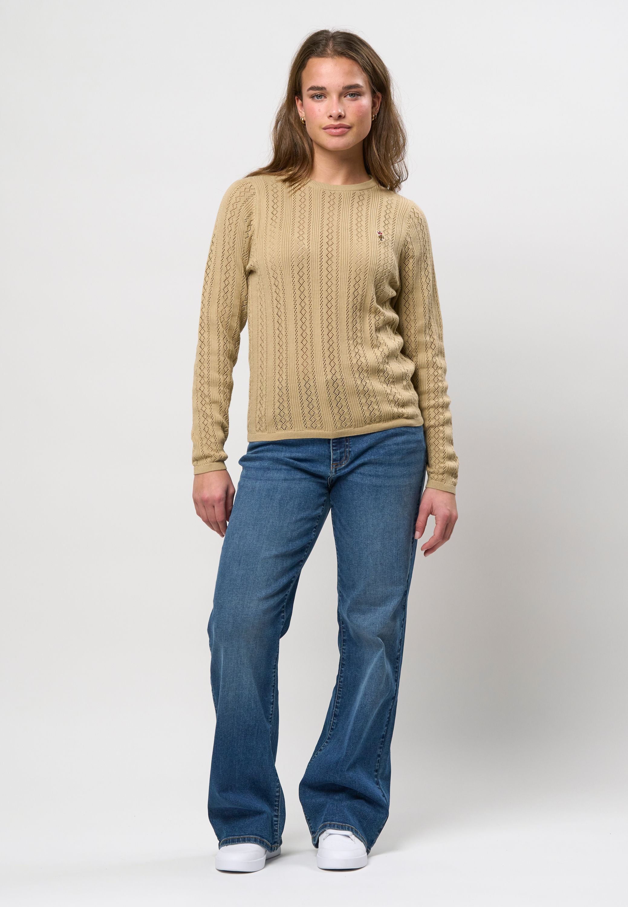 Mynthe er en elegant og feminin striktrøje, der kombinerer klassisk design med moderne lethed. Den er fremstillet i 100 % økologisk bomuld og har et smukt hulmønster, der giver et sofistikeret og luftigt udtryk. Rund halsudskæring og fine ribkanter afslutter looket på diskret vis, mens det broderede U.S. Polo Assn.-logo på brystet tilføjer et eksklusivt touch. Perfekt til både hverdagsbrug og til lag-på-lag styling i de køligere måneder.